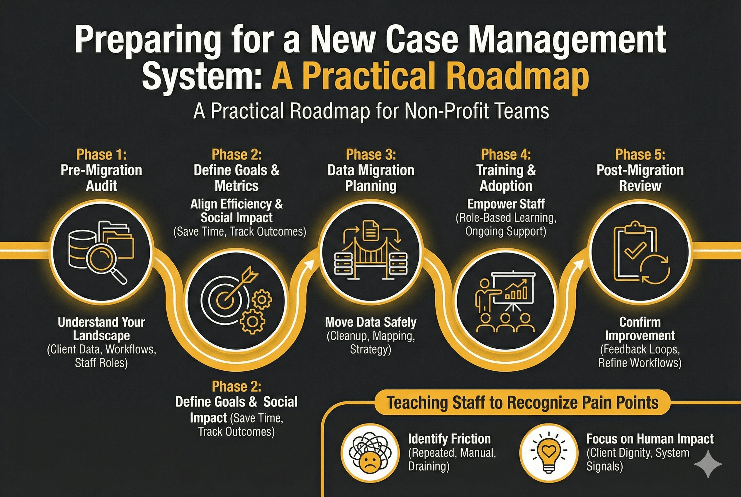 Prepare for your new case-management system by auditing workflows and defining clear impact goals. This framework covers pre-migration audits, secure data transfer, and role-based training to ensure dignity for clients, reduced staff burden, and high-fidelity reporting for your board and funders.
